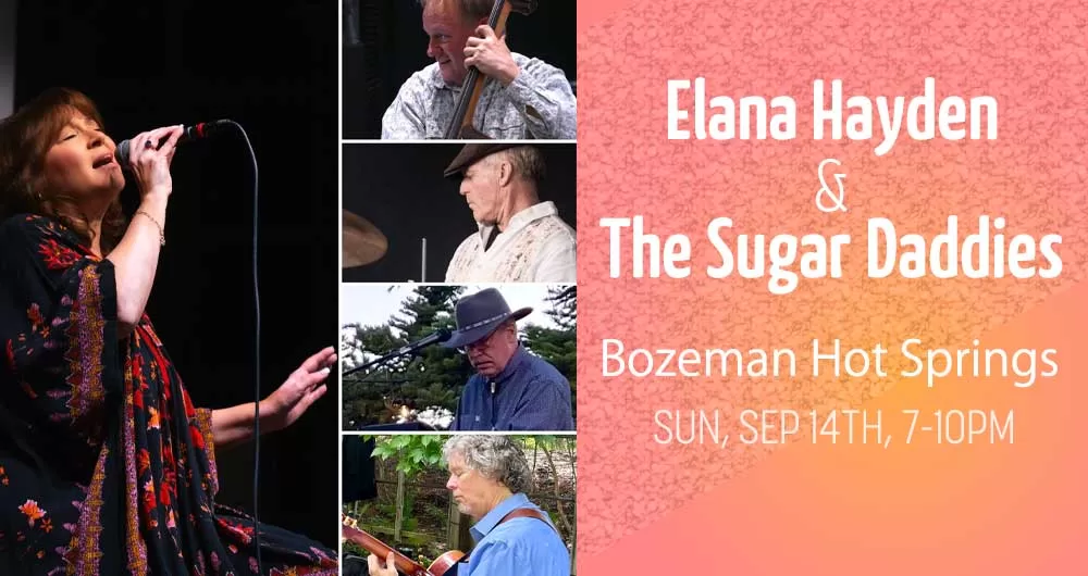 Join Elana Hayden and the Sugar Daddies at Bozeman Hot Springs for some country-fried jazz! Relax and enjoy a night of jazz, blues, and country music! Featuring Elana Hayden on vocals, Mike Leslie on bass, Mike Gillan on drums, Jeff Troxel on guitar, and Joe Sullivan on piano.
