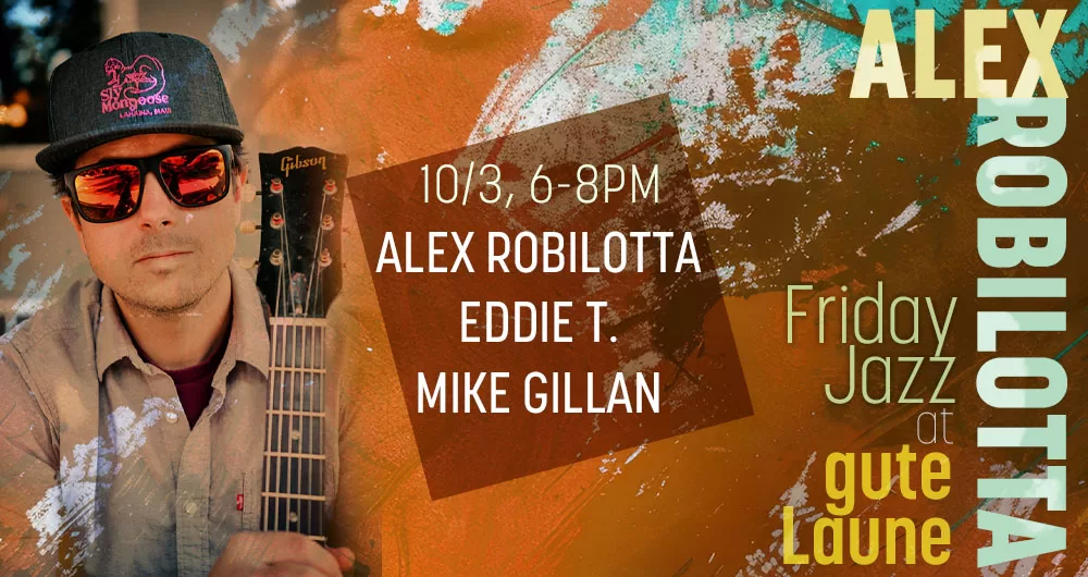 Friday Night Jazz at gute Laune (upstairs at the Rialto)! Come join Alex Robilotta Trio – Alex Robilotta on guitar, Eddie T. on bass, and Mike Gillan on drums. Enjoy their sounds with good beer, good food, and good vibes!