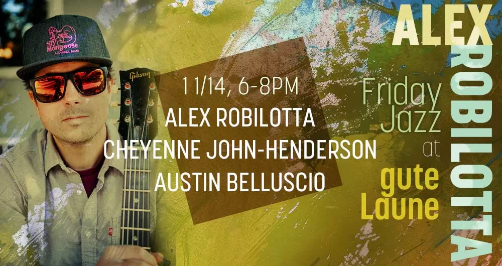 Friday Night Jazz at gute Laune (upstairs at the Rialto)! Come join Alex Robilotta Trio – Alex Robilotta on guitar, Cheyenne John-Henderson on keyboard, and Austin Belluscio on drums. Enjoy their sounds with good beer, good food, and good vibes!