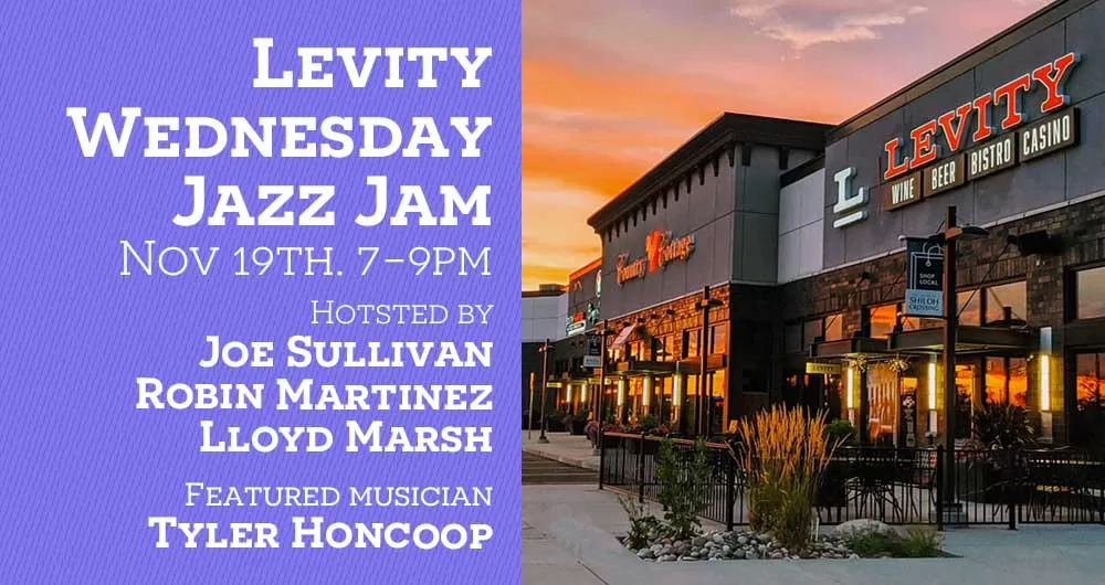 Every Wednesday, Levity features Jazz Jam starting at 7:00 p.m. It’s a Jam Session with local jazz musicians. This week, the house band – Joe Sullivan on keyboard, Robin Martinez on bass, Lloyd Marsh on drums, with guest musician Tyler Honcoop on trumpet – will be hosting the jam session! There are always familiar faces, but it’s open to anyone who can play. All you need is raw talent and your instrument!