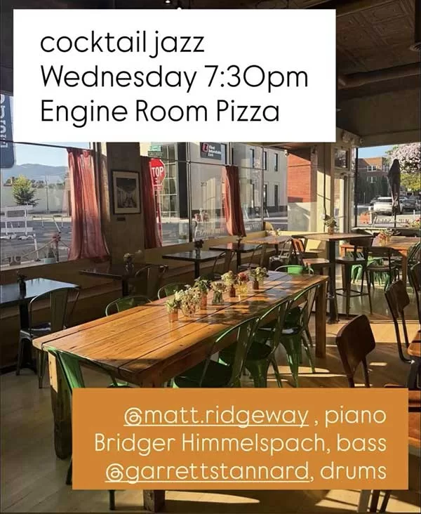 Cocktail Jazz at Engine Room Pizza in Livingston this Wednesday! Garrett Stannard on drums, Matt Ridgeway on piano, and Bridger Himmelspach on bass will be playing from 7:30 PM to 9:00 PM!