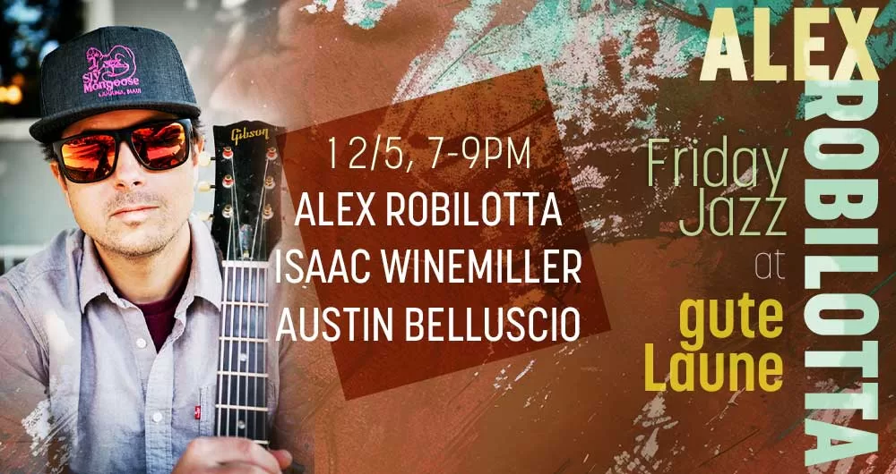 Friday Night Jazz at gute Laune (upstairs at the Rialto)! Come join Alex Robilotta Trio – Alex Robilotta on guitar, Isaac Winemiller on bass, and Austin Belluscio on drums. Enjoy their sounds with good beer, good food, and good vibes!