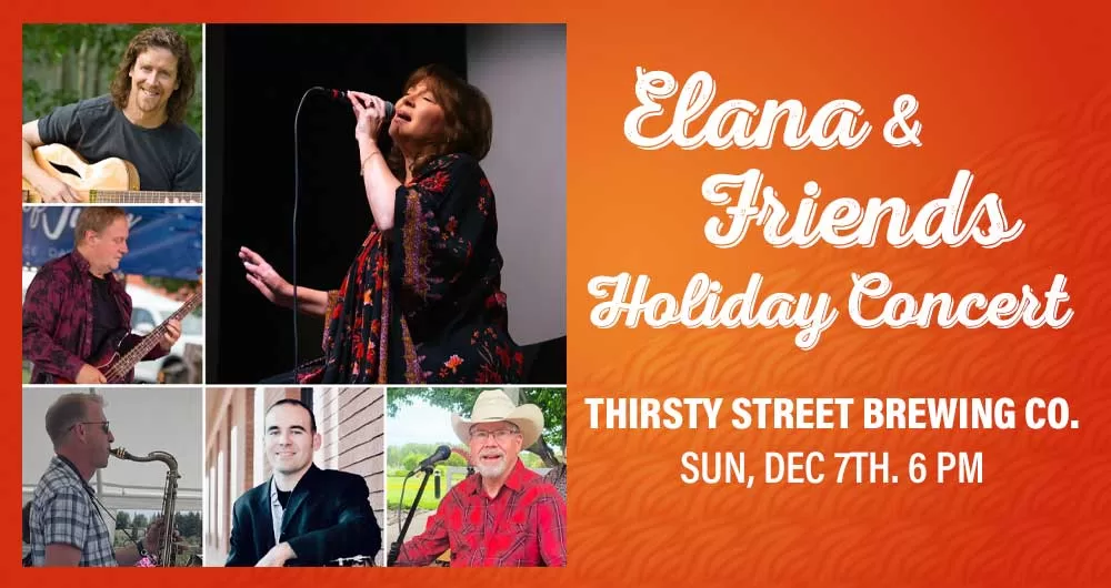 Join Elana Hayden & Friends for a Holiday Concert at Thirsty Street! Feat. Elana Hayden (vocals), Mike Leslie (bass), Joe Sullivan (piano), Zach Paris (drums), Jeff Troxel (guitar) and Scott Jeppesen (sax).