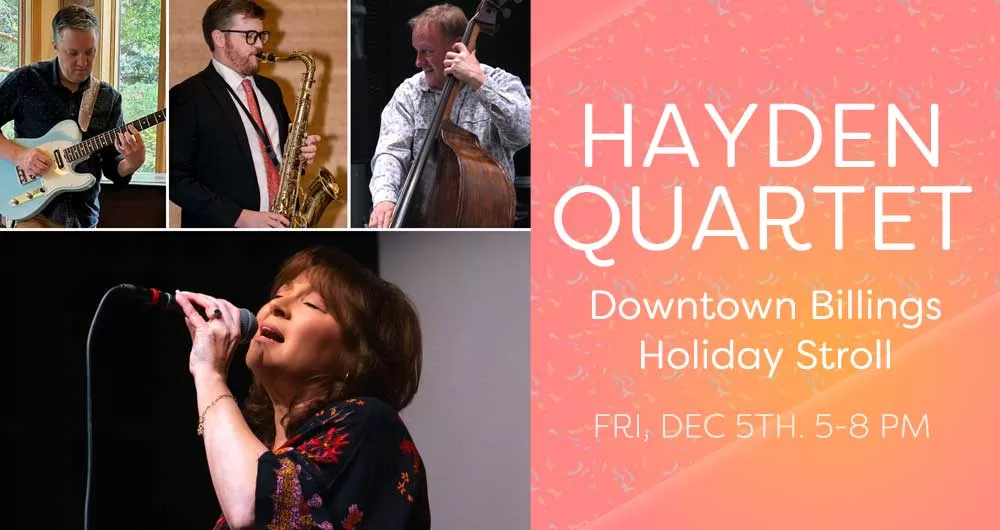 Enjoy LIVE MUSIC with the Hayden Quartet feat. Elana Hayden (vocals), Alex Nauman (guitar), Mike Leslie (bass) & Sam Woodis (sax) for First Friday / Downtown Billings Holiday Stroll! The group is playing indoors at YesterYears Antique Mall (208 N Broadway, Billings). Support downtown businesses while you spread and share holiday cheer!