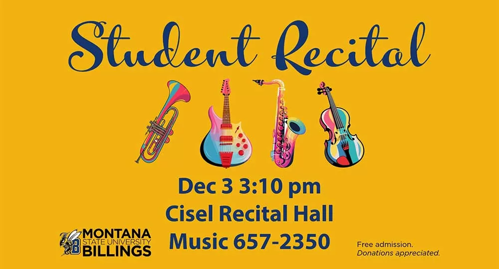 MSUB Music Majors will perform at this final Student Recital of the Fall Semester 2025. Students will perform in a variety of genres and instruments at Cisel Recital Hall, Wednesday, December 3, 2025 at 3:10 pm. Free Admission. Donations appreciated.