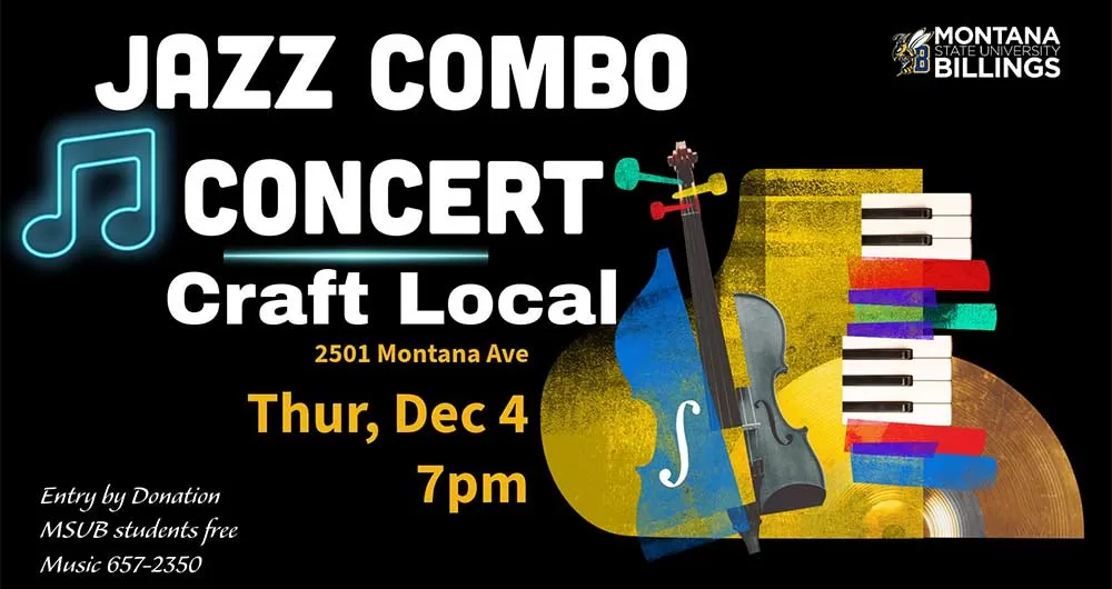 MSUB Small Jazz Ensembles, directed by Dr. Scott Jeppesen and Mr. Alex Nauman, will perform live in concert on Thursday, December 4th, 2025, at 7:00 pm at Craft Local. Entry by Donation. Your donations are appreciated. MSUB Students are free with ID.