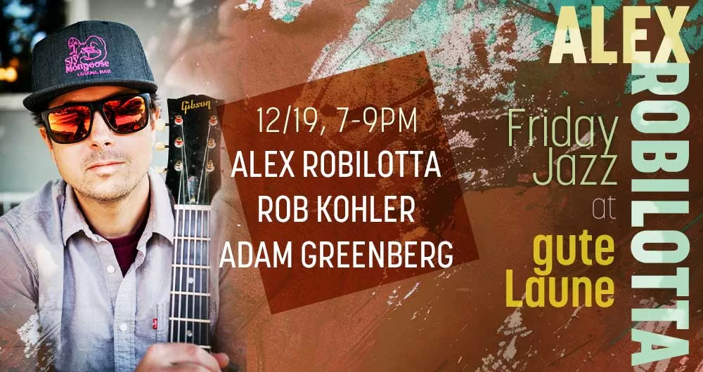 Friday Night Jazz at gute Laune (upstairs at the Rialto)! Come join Alex Robilotta Quartet – Alex Robilotta on guitar, Rob Kohler on bass, and Adam Greenberg on drums. Enjoy their sounds with good beer, good food, and good vibes!