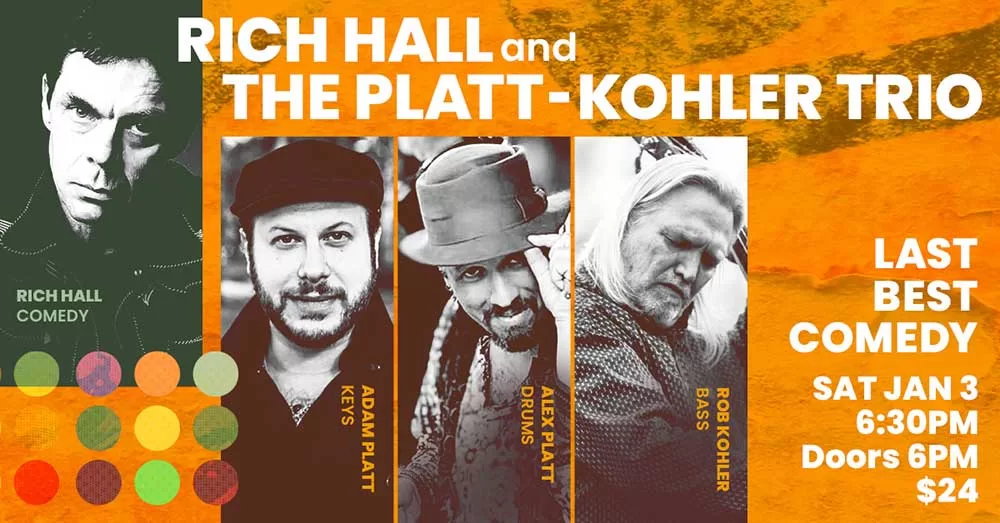 The legendary Rich Hall headlines a special night of comedy and music at Last Best Comedy. Joined by The Platt-Kohler trio (Adam Platt, Alex Platt, and Rob Kohler), this will be a memorable night of jazz and comedy!