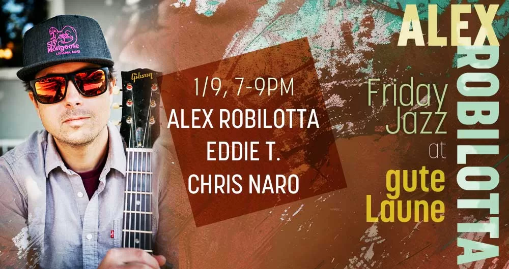 Friday Night Jazz at gute Laune (upstairs at the Rialto)! Come join Alex Robilotta Quartet – Alex Robilotta on guitar, Eddie T. on bass, and Chris Naro on drums. Enjoy their sounds with good beer, good food, and good vibes!