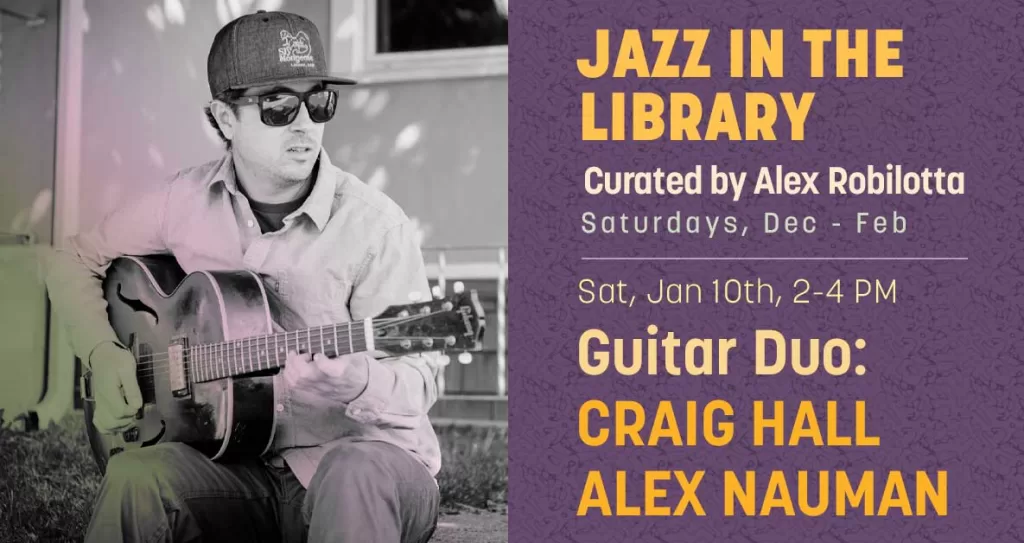 The weekly Improvised Music at the Library, curated by guitarist Alex Robilotta on Saturdays from 2:00 – 4:00 PM, upstairs at the Bozeman Public Library. This week, fabulous guitar duo Craig Hall & Alex Nauman will be making fantastic sounds. Please join them and enjoy their music!