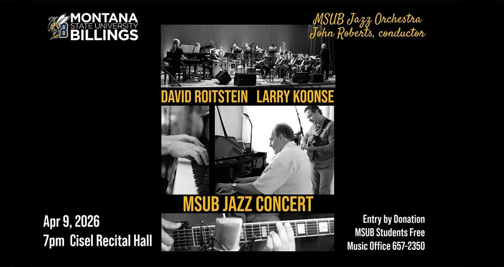Guitarist Larry Koonse and Pianist David Roitstein join the MSUB Jazz Orchestra conducted by Professor John Roberts for a Spring Jazz Concert on Thursday, April 9, 2026, at 7:00 pm at the Cisel Recital Hall. Entry by Donation. MSUB students are free with ID.