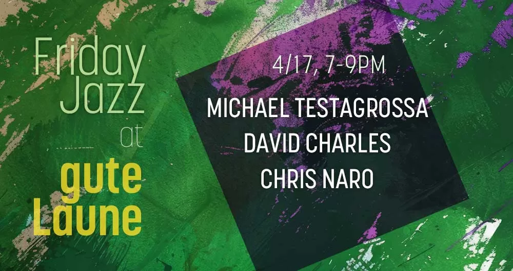 Friday Night Jazz at gute Laune (upstairs at the Rialto)! Join Michael Testagrossa on bass, David Charles on keyboard, and Chris Naro on drums. Enjoy their sounds with good beer, good food, and good vibes!